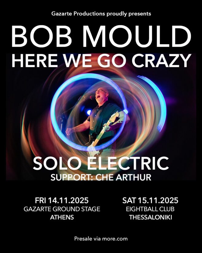 Ο Bob Mould εμφανίζεται ζωντανά την Παρασκευή 14 Νοεμβρίου στο Gazarte Ground Stage στην Αθήνα και το Σάββατο 15 Νοεμβρίου στο Eightball Club στην Θεσσαλονίκη.