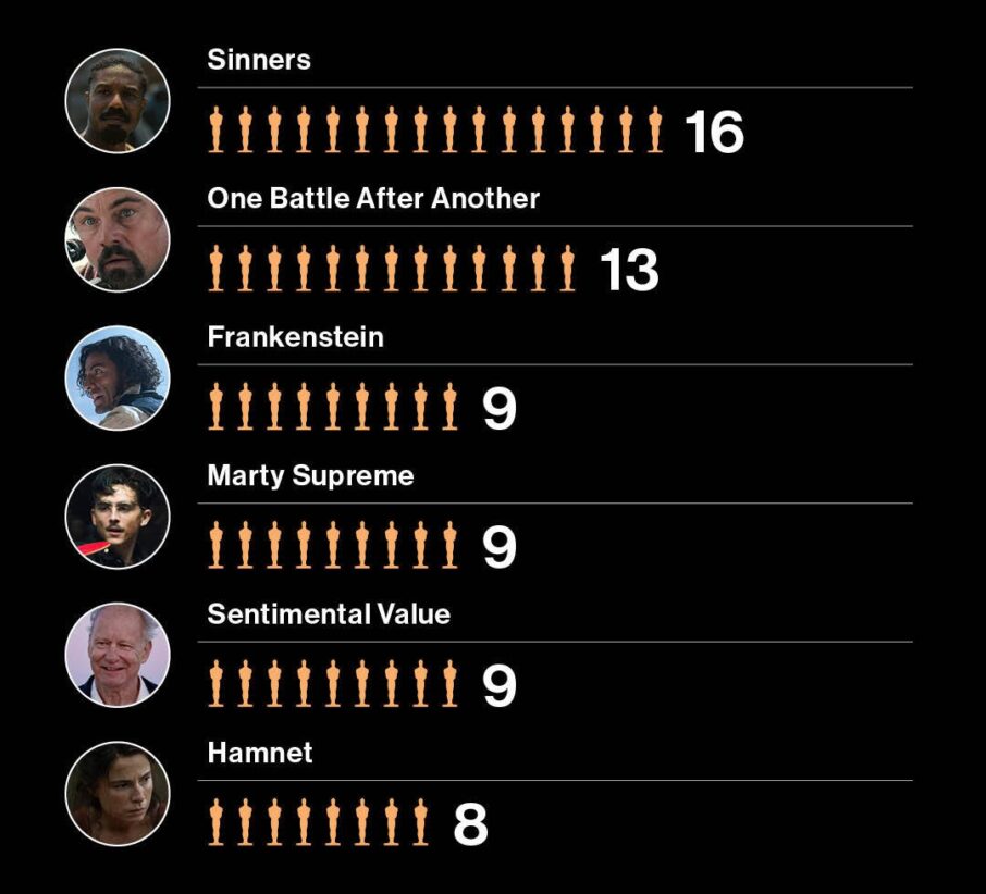 Το άλλο μεγάλο φαβορί της χρονιάς, το One Battle After Another του Paul Tomas Anderson, θα διεκδικήσει συνολικά 13 βραβεία.  Για την καλύτερη ταινία υποψήφιες είναι ακόμα τα Bugonia, F1, Frankenstein, Hamnet, Marty Supreme, The Secret Agent, Sentimental Value και Train Dreams.
