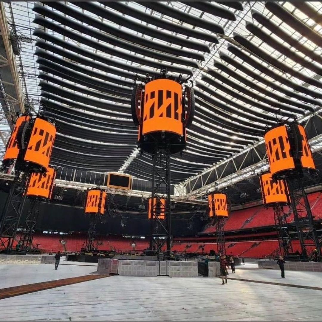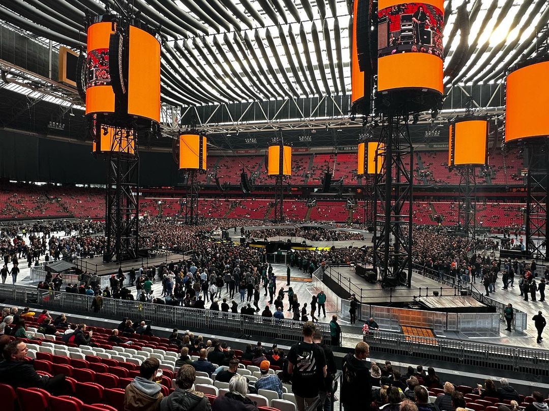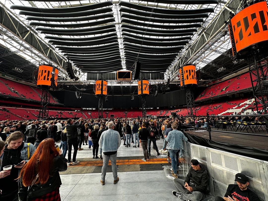 Έχει στηθεί στο κέντρο του γηπέδου, κάτι που ξέραμε ότι θα γίνει, αλλά όπως και να κάνουμε, άλλο να το ακούς και άλλο να το βλέπεις. Ακολουθούν οι πρώτες εικόνες με τους οκτώ τεράστιους πυλώνες να δεσπόζουν και να περικυκλώνουν τη σκηνή ενώ στο κέντρο υπάρχει το παραδοσιακό pit που έχει το συγκρότημα σε όλες τις εμφανίσεις του.